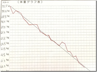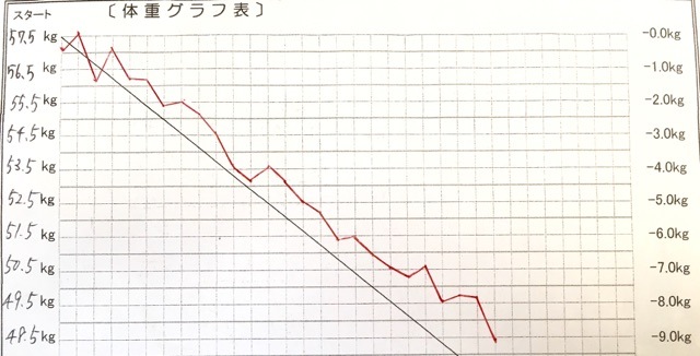 黒い線が3ヶ月で10kgやせるという基準の線で、赤い線が体重変化なのですが、ほぼ10kgペースから外れることなく綺麗に10kg以上おやせになられました![]()